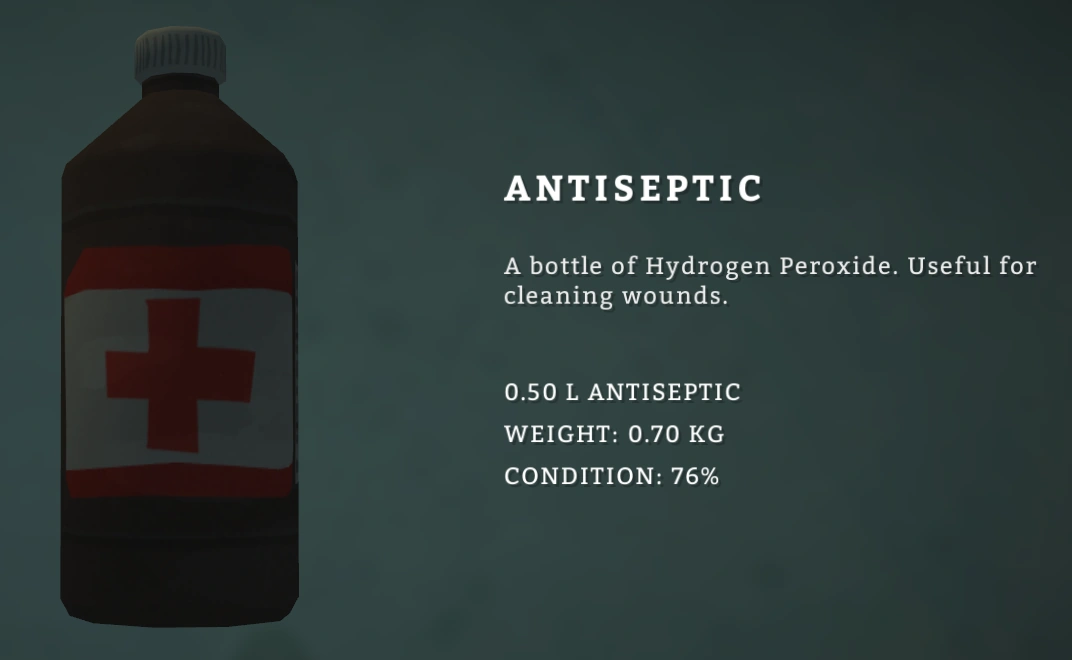 L'antiseptique est utilisable via l'onglet Médical du menu radial ou l'inventaire, mais uniquement en cas de risque d'infection. Un traitement unique réduit considérablement le risque d'infection; après avoir utilisé un antiseptique sur toutes les plaies, l'infection ne se propagera pas sauf si une plaie n'est pas traitée avant plusieurs heures. La mèche barbe de jupiter est une alternative naturelle à l'antiseptique.