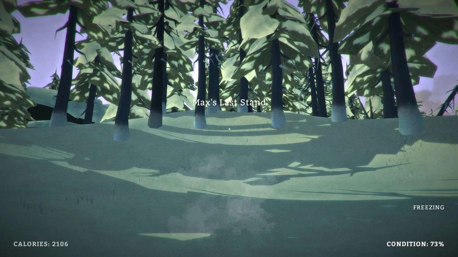 Sous un arbre solitaire, un cadavre gelé (vraisemblablement Max) se trouve face cachée dans la neige. Une hachette ou un fusil de chasse peuvent se trouver à côté du cadavre. Les appels continus des corbeaux encerclant le corps peuvent servir de "repère" pour naviguer dans le paysage vallonné autour de la cabane du trappeur.