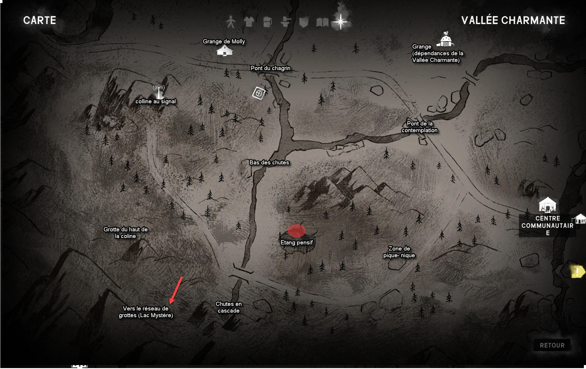 Les pique-niqueurs peuvent faire du canoë et, lorsque le temps est suffisamment ensoleillé, s'asseoir sous le belvédère. Une cabane avec un trou de pêche et un poêle à bois se trouve au centre de l'étang. De plus, la cabane de pêche a également une porte, ce qui en fait un abri temporaire décent. Pour les joueurs avec des vêtements suffisamment chauds et un sac de couchage, l'accès relativement facile de la cabane pour la chasse, la pèche et le bois de chauffage signifie qu'elle pourrait servir de base secondaire pour des "retraites" de chasse et de pêche de plusieurs jours pour lutter contre la fièvre de la cabine. Faites attention aux falaises environnantes et aux prédateurs rôdant dans des conditions de faible visibilité. Il y a une chance que le revolver soit présent à l'intérieur de la cabane de pêche.