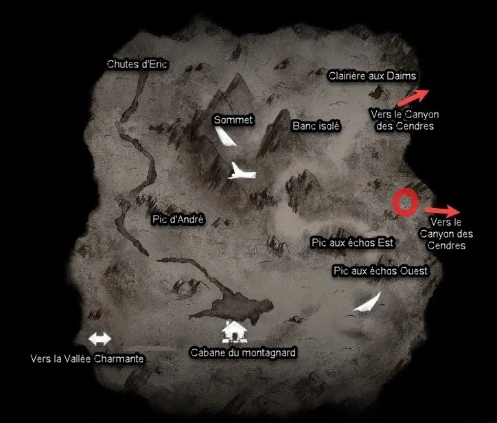 Le ravin aux Echos est un point de départ potentiel pour les nouveaux joueurs, notamment en mode de survie Intrus. Un cadavre gelé, plusieurs buissons de Cynorrhodon et du bois de chauffage peuvent être trouvés à cet endroit.