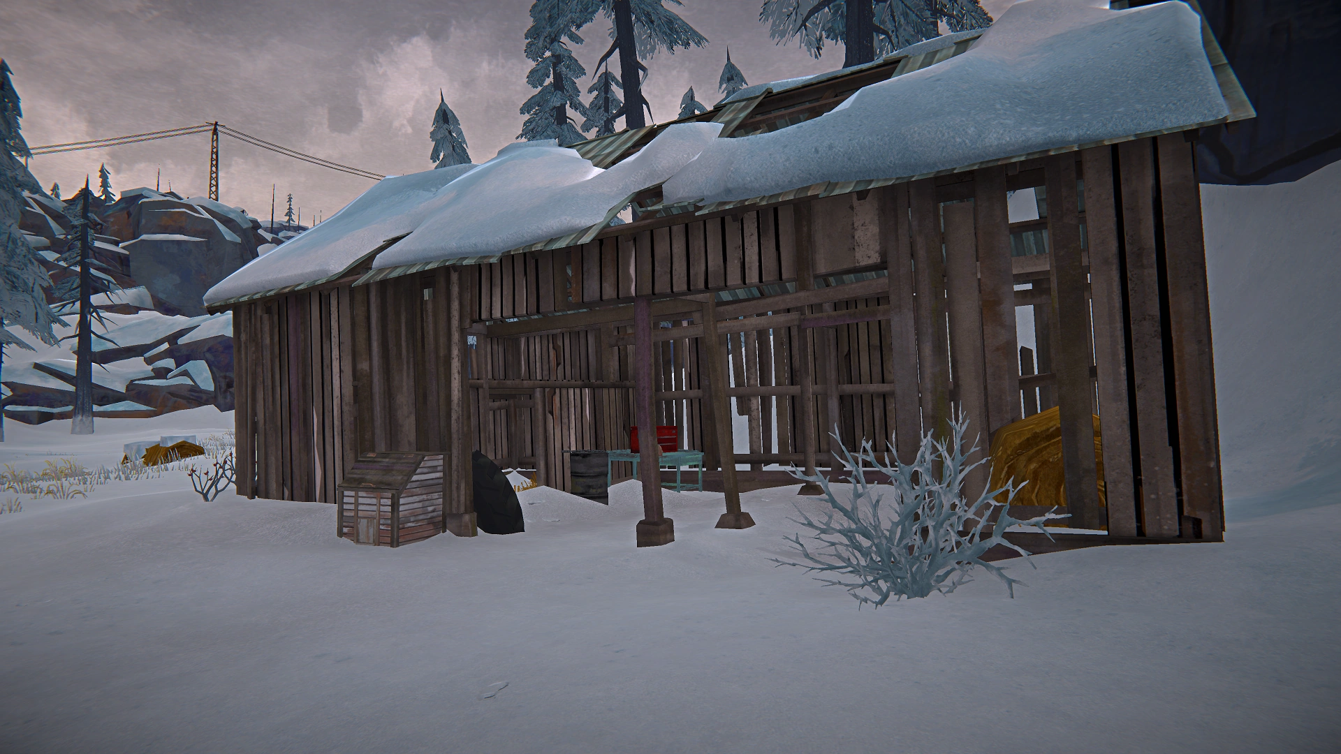 The location features a small, abandoned hay barn, similar to the one at Paradise Meadows but smaller. Its two most useful features are a hay bed and a workbench, although due to the lack of having an interior, it may be necessary to light a fire in the nearby Fire Barrel when sleeping here during cold weather. Overall, sleeping or crafting in the trailer at Foreman's Clearcut is usually a better idea, unless trying to fight Cabin Fever.