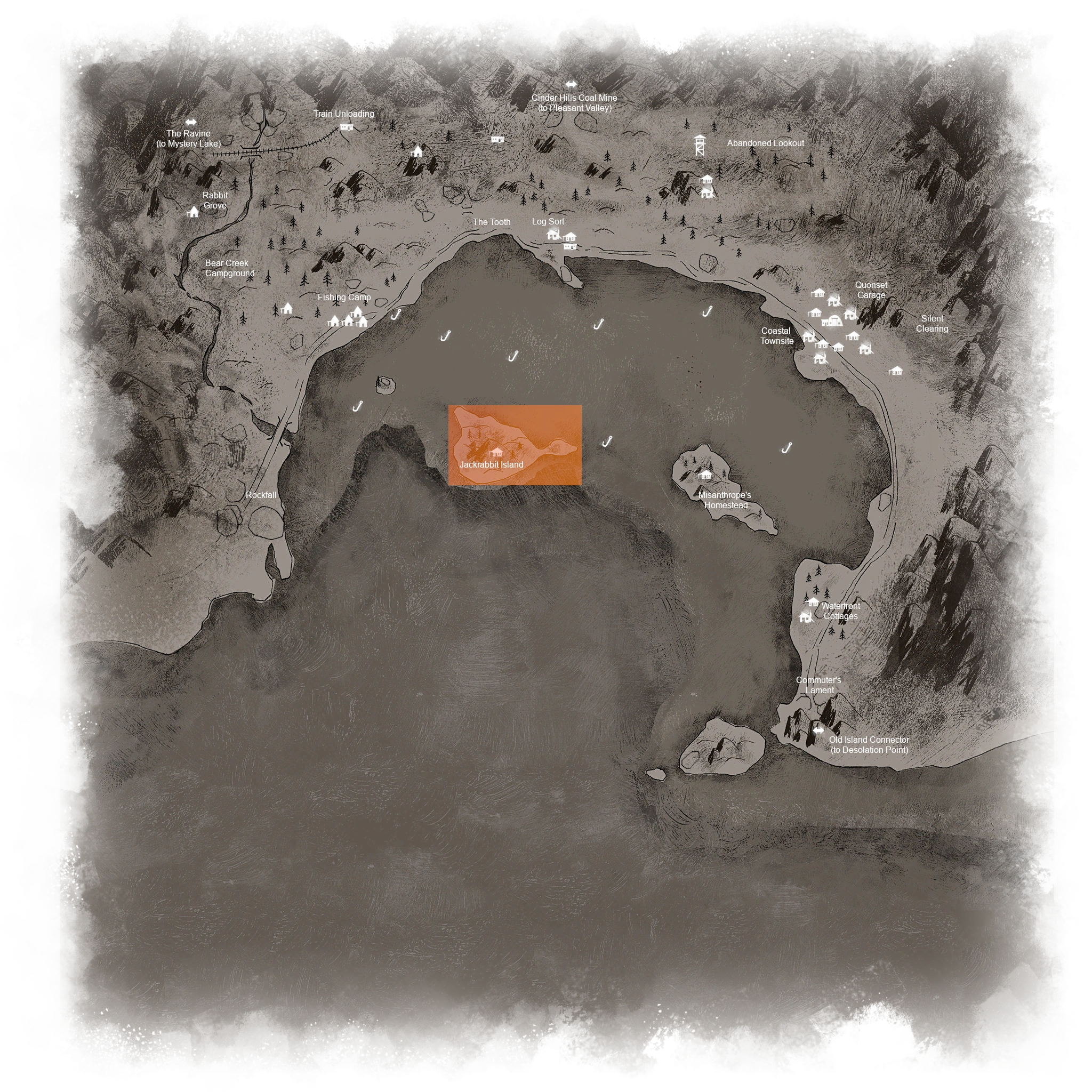 The main disadvantage of Jackrabbit Island as a long-term base is its lack of a stove, forcing the player to make campfires outside to cook rabbits and make water. A less obvious disadvantage of the island is that it can be very difficult to find in low visibility conditions. Finally, one challenge with Coastal Highway in general is the lack of warm caves to fight cabin fever, meaning the player will need to use vehicles or fishing huts to sleep if they catch cabin fever.