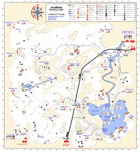 As described in "Mystery Lake & Area" from Episode 2, the region of Mystery Lake is an alpine valley, averaging 1,200 meters above sea level, centered around its namesake lake. The lake itself is surrounded by forested hills, and there is much passive wildlife in the area. While there are wolves and bears, they are much less common here than in other regions. Temperatures are not as mild here as they are in Coastal Highway, however, they are by no means as cold as around Timberwolf Mountain or Ash Canyon. The region offers plenty of shelter, with cabins and trailers scattered throughout the forested hills, as well as Ice Fishing and lots of foraging. Beyond the lake and hills, mountains surround the region on the west and south sides, while the foothills of the Inner Island Range can be seen on the region's north and east, forming a barrier through which players cannot travel.