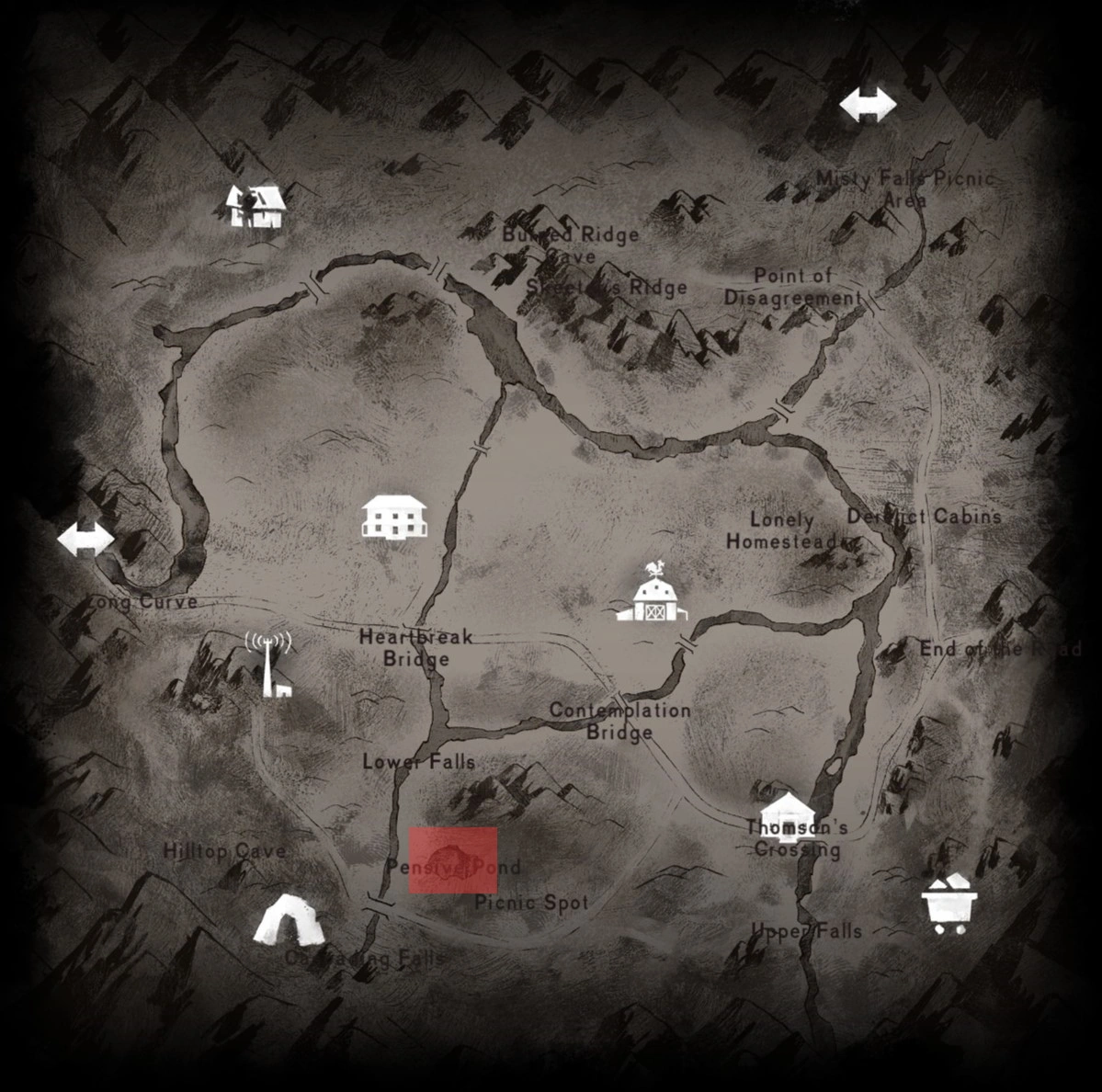Pensive Pond can be found easily from Pleasant Valley Farmstead. Standing at the round silo on the farmstead, turn to face Heartbreak Bridge. Cliffs can be seen in the background, on top of which Pensive Pond can be found. Following Lower Falls and climbing up carefully, some shelter, fishing or a picnic can be had.