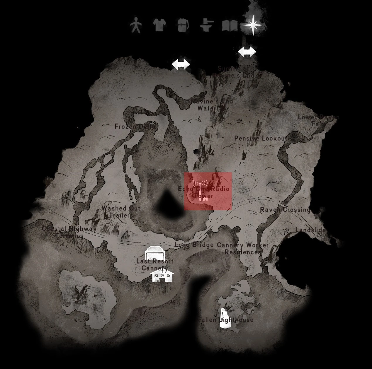 The Radio Control Hut is arguably the most remote location in the region, being not only in a place that has a single point of entry upon first arriving in the region, but also standing at the very end of the plateau area. To reach the Radio Control Hut, the Survivor needs to pass the Lookout, which is patrolled by a pack of Timberwolves, then walk by a parking lot (that contains both a Memento as well as some more wolves) then cross a wooden bridge high above the inlet to finally reach the Control Hut itself.