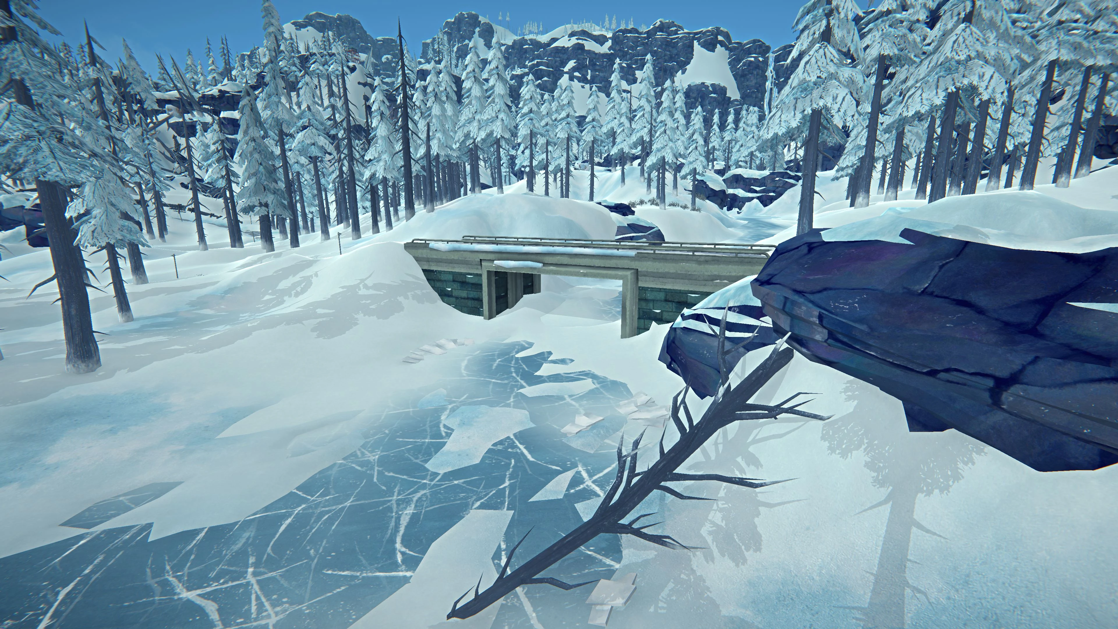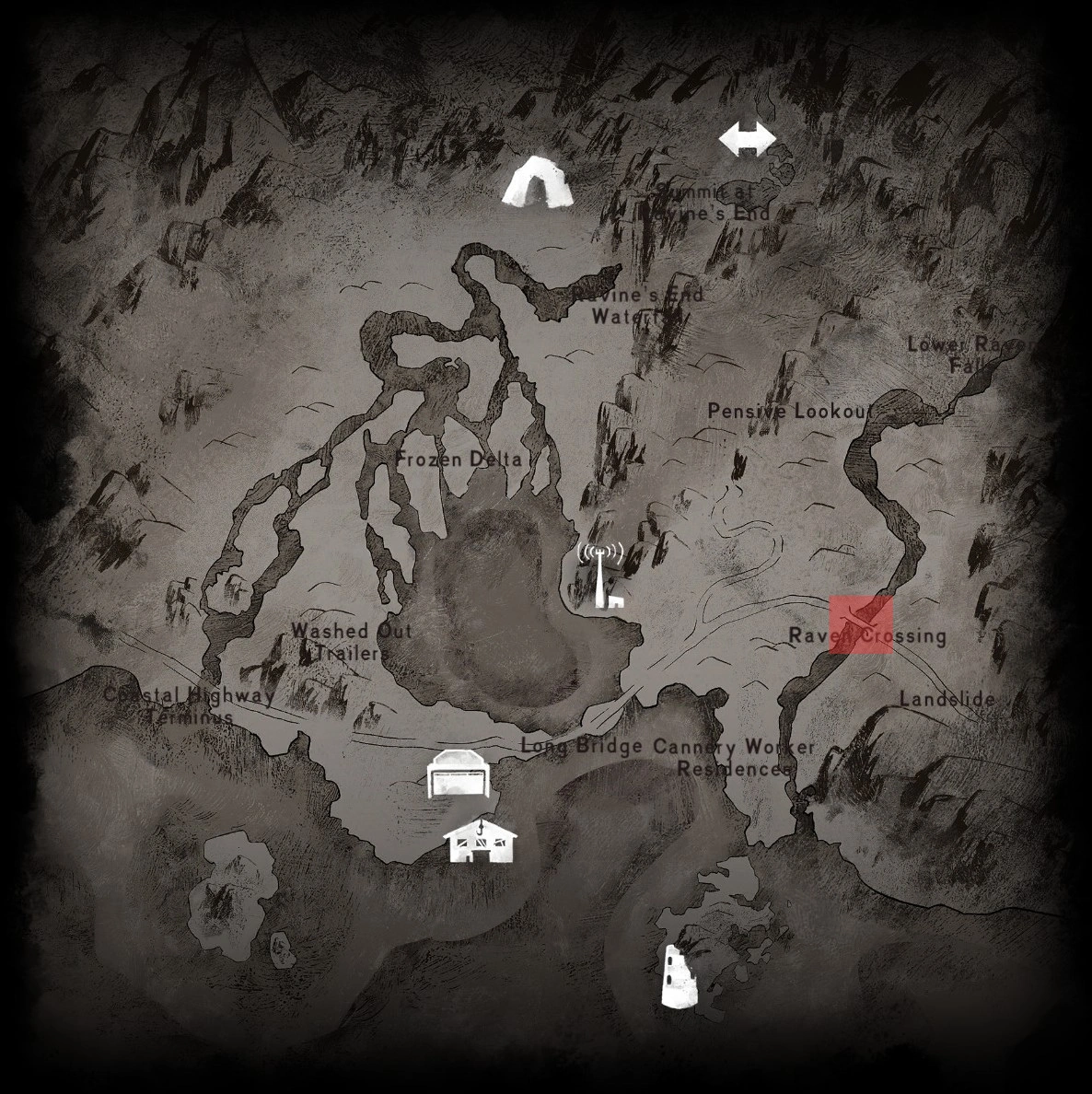 Raven Crossing is a short bridge, presumably crossing the Raven Creek, located a short walk west of the Landslide, and roughly halfway between the Cabin and the Cannery Worker Residences.