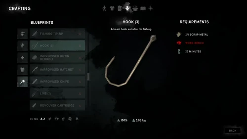 Items can be sorted alphabetically, by preparation times, or by calorie amounts by looking in the bottom left of the screen. Ingredients needed to create recipes are shown on the right side. The overall condition, calories, hydration, and weight are shown in the bottom middle, as well as any Afflictions that this Recipe will boost or remove. Some Recipes can add or remove positive Afflictions, while others can add or remove harmful ones.