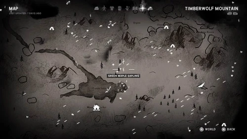 In Survival Mode, players must draw the map themselves using Charcoal. The player's position is never shown, and so they must pinpoint their current position via surveyed landmarks on the map related to their surroundings. Text in the top left corner of the screen tells you how long ago you last updated the currently selected region map (in in-game time). A 'World' button at the bottom right of the screen allows you to switch from the region map to a world map of eother Lower Great Bear or the Far Territory sections of Great Bear Island.