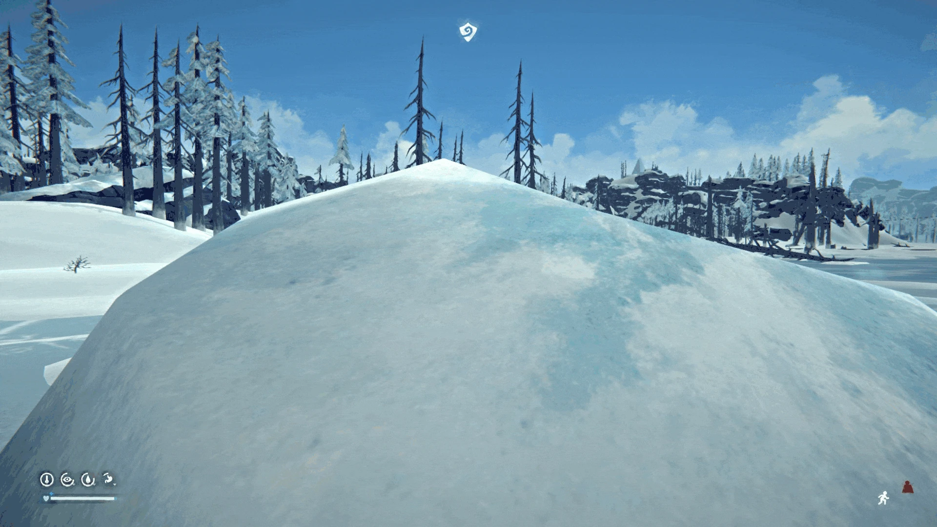 The Wind Shield is an icon which appears at the top of the UI if a solid object is between the player and oncoming High Winds. When shielded, Windchill temperature is eliminated almost completely and the player is only subjected to the ambient Air temperature. This icon can be used to stay warmer, move faster, or to find campfire locations currently sheltered from the wind. High Winds slows movement in 45° cone around the wind's current direction across the entire region, and a 2m radius around solid objects; this means that to be sheltered from the wind the player (or a campfire) must be on the correct side (opposite) of a solid object relative to oncoming wind and be close to it.